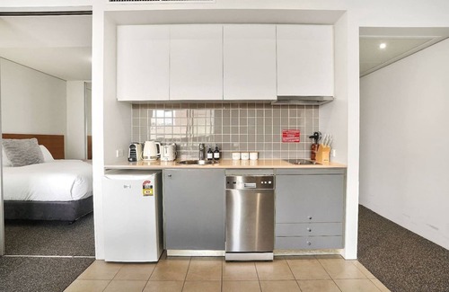 Our one-bedroom holiday apartment at Harbour Lights combines comfort and convenience, creating a relaxing retreat in the heart of the city. The cosy living area features a plush sofa and a flat-screen TV, perfect for unwinding after a day of exploring. The bedroom is a haven of tranquility, with a luxurious king-sized bed, soft linens, and ample storage. Natural light fills the space, offering a peaceful ambiance. The modern bathroom includes a spacious shower, fresh towels, and essential toiletries for your convenience.