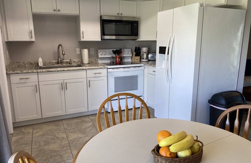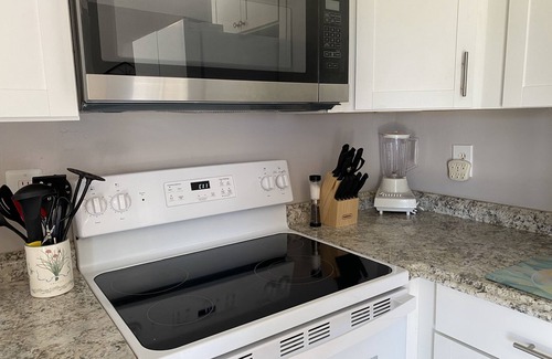 The duplex is fully furnished with two queen beds and comfortable living room furniture, dining room set and casual, comfortable furnishings on the lanai. Wi-Fi and a giant smart TV will keep you entertained on quiet evenings. Games and books are on hand for an afternoon on the lanai or to take to the beach. Beach furniture and towels are ready for use. The kitchen is designed for full service with dishes, silverware, pots and pans and an assortment of plastic dishes and drink wear to take to a picnic or to the beach, new electric stove and microwave and a new refrigerator with ice maker. All the small appliances you will need including toaster, blender, electric can opener, both a coffee maker and Kureg. The bath has a tub and shower and plenty of fresh towels, hair dryer and starter soaps, toilet paper and Kleenex. The linen closet is stocked with plenty of extra sheets, kitchen towels, blankets and a large basket full of bright throws to cover you as you enjoy the screened lanai in the evening, watching the stars. The large lanai is screened with protection from insects and allows you to enjoy the beautiful view all day and evening. Private washer and dryer in the utility room also includes starter detergent pods, cleaning products, fabric softener and dryer sheets.