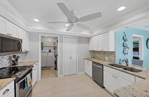 The kitchen is fully equipped with brand new stainless appliances and granite countertops with 6 comfy barstools for casual dining.