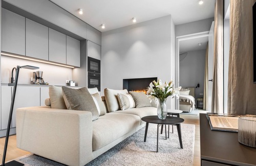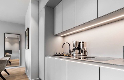 The heart of the apartment is the open-plan living area, featuring a high-quality SieMatic kitchen and a stylish dining area. Here, you can prepare culinary delights and enjoy them together at the dining table. The cozy living area, complete with a sofa, Smart TV, and ethanol fireplace, invites you to spend relaxing evenings. Enjoy the warmth of the fireplace and reflect on the day.