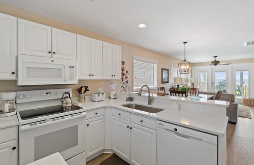 Accommodating up to 6 guests, this tastefully decorated lower level condo is bright and light and airy! The spacious open-concept living room/dining room/kitchen area is complete with beautiful beach décor and comfortable furnishings. You will appreciate the light ceramic tile flooring with modern ceiling fans and updated lighting. The kitchen is well appointed and offers everything you will need to create gourmet meals at home. With updated kitchen cabinets and countertops, there is bar seating for 3. This unit is complete with a full size washer and dryer. This unit accommodates up to 6 guests. Bedroom #1 offers a Queen bed, TV, ceiling fan and full private bath with tub/shower combo, and amazing ocean views! Bedroom #2 offers a Queen/Twin bunk bed with a twin trundle, TV, ceiling fan and shares the full hall bath with tub/shower combo, and a street side view.