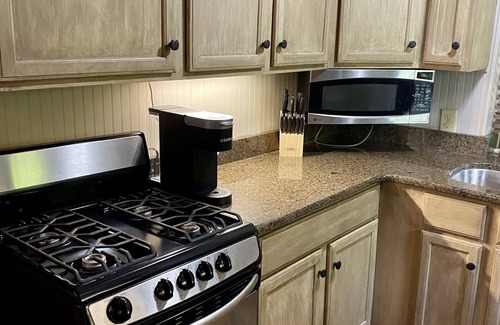 The kitchen features granite countertops with a full size refrigerator, gas stove, microwave and Keurig coffee maker.
