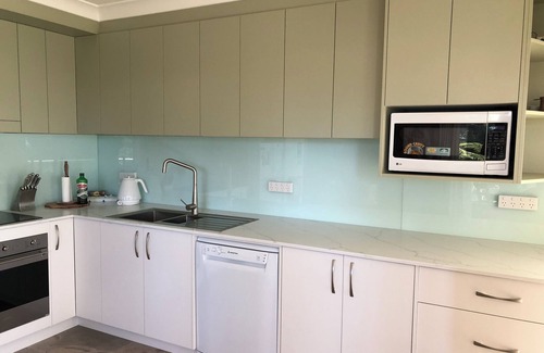 Waterview Apartment has a fully renovated kitchen with Bosch induction cooktop and SMEG oven. The kitchen also has microwave, dishwasher, and washing machine.