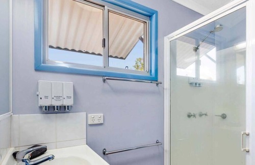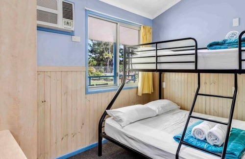 Accommodates up to 7 people. This 2 bedroom self-contained Waterview Villa has everything you are looking for as a holiday destination to relax unwind. Entering onto a large balcony with a Dog House and built in BBQ, then open into a comfortable lounge and dining area immediately you will find the comforts of home with a double pull out sofa bed/lounge and 40 TV. Reverse cycle air-conditioners are provided in the living room and each bedroom. The master bedroom offers a queen bed and 32 TV whilst the second bedroom offers a treble bunk set (double on the bottom and a single on the top). The bathroom offers a shower and a separate toilet. All linen is provided. The kitchen is fully equipped with a full size fridge, convection microwave, electric cook top, kettle and toaster, everyday cutlery, crockery and utensils. Parking for 1 car available.