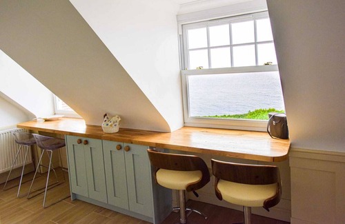 The apartment itself has a beautiful fitted kitchen with breakfast bar looking out to sea, spacious and comfy lounge/diner, again with sea views. The master bedroom has a Jack and Jill ensuite bathroom with bath and walk in shower. The second bedroom has twin beds and arguably the best view of all. There's also a balcony off the hallway if you want to take in some fresh sea air.