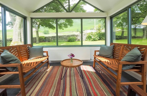 Upstairs are two bedrooms, one with a comfortable king-sized bed, the other with both a king-sized and a single bed. There is a modern bathroom with tub and shower upstairs, and a second bathroom with shower in the utility room downstairs, which also provides a washer and dryer for guest use. Enjoy your morning tea or happy hour wine in the new light-filled conservatory, with sweeping views of Black Combe and resident sheep.