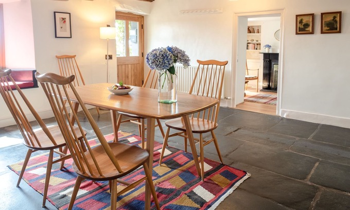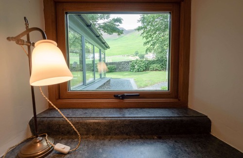 After that walk on the fell, you’ll want to relax in the Cottage’s cozy sitting room with its wood-burning fireplace. An adjoining spacious dining room has old oak beams, ancient worn slate floors, a wood-burning stove and access to the front enclosed garden. A large, well-stocked kitchen features an Esse cooker, Cumbrian slate countertops, and views of the fell and rear garden.
