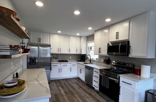 THE SPACE: Inside, you will find four generous bedrooms, a fully equipped kitchen, sparkling bathrooms, and a spacious living area with access to an inviting outdoor deck. This two-story home has 3 bedrooms with queen beds on the main floor. The first floor consists of the dining and kitchen area that flows into the living room.