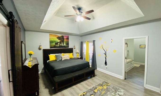 The whole group will enjoy easy access to everything, from this centrally located home away from home. Relax and enjoy the master suite that features a comfortably oversize jacuzzi tub for two! Enjoy a fun day filled with playing a game on the pool table or board games with family and friends. Comfortable quality size mattresses providing the best sleep. Two separate living rooms for a large group. Enjoy the back patio with a cup of coffee or hot chocolate. It is also equipped with a grill. There is also a fire pit in the backyard in which wood is also provided.