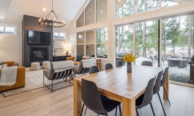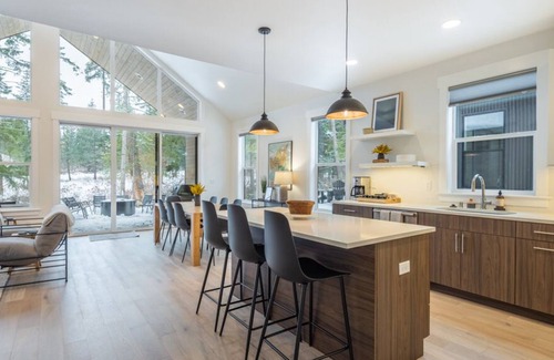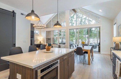 This cabin has a stunning free-flowing design from the kitchen, dining and living areas enhanced by large windows and a fireplace. The dining area can seat eight people comfortably and the gourmet kitchen offers island seating for an additional three. The kitchen boasts all the stainless-steel appliances needed for a home-away-from-home experience.