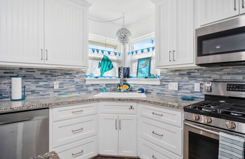 Step inside and discover an open-concept living space that feels like a mermaid’s paradise. The spacious living room, with its luxurious seating, is the perfect spot to unwind after a day of adventure, complete with a large smart TV for all your entertainment needs. The kitchen is a true masterpiece, fully equipped with modern appliances like a gas stove, blender, and a large pot coffee maker – everything you need to whip up your favorite meals and snacks. A beautiful bay window floods the dining area with natural light, creating an inviting space to gather around the table for meals or simply enjoy the view.