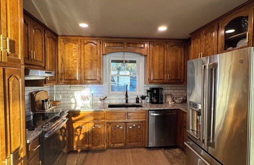 Welcome to our home! Relax in the living room that overlooks the lake, has a large flatscreen, and an electric fireplace. Each bedroom is equipped with plush beds and flat-screen TVs. Enjoy your meals in the dining area with seating for 8, adjacent to a fully stocked kitchen. Play pool, unwind in the soothing hot tub, or lounge around the fire pit. There is a private boat ramp and dock with two swings, offering the perfect spot to watch the sunset. Come, unwind, and make lasting memories.