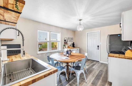 Opening the front door you will find the floors to have all new luxury vinyl flooring and tastefully decorated. In the living room I have chosen the seating arrangement to be conversational and inviting. This includes an 84” sleeper futon couch, relaxing furniture, board games, variety of books and a large smart TV. Note: There is also an AC window unit located in the living room. If the temperature is hot outside, I recommend to turn the AC unit on when you check in so you can cool the suite off while your outside enjoying the town!