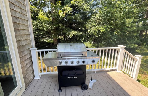 Sitting on the edge of the Ridge Club golf course (14th and 15th holes), this spacious modern loft has 3 bedrooms with 2-FL high ceiling living room, electric fireplace, sunny Palladian window, new kitchen and more. Enjoy the views of the golf course from dining room, grilling on deck or lighting bonfire at backyard! Minutes to Mashpee-Wakeby pond, Sandy Neck and Craigville beaches that you will enjoy swimming, boating, fishing and take a sunbath! Close to Mashpee Commons for convenient shopping. Sleep up to 10 guests with bed sheets , soap/shampoo provided, free Starbucks coffee!