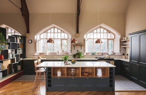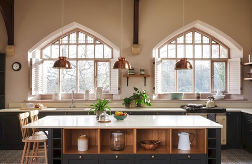 Open plan living area which features the traditional vaulted ceiling with exposed beams and large feature windows in the gothic style of the period.