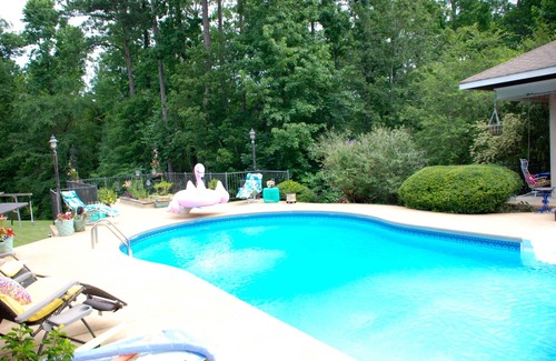 this is a very private location set on 11 acres -2 acres are fenced & groomed the rest of the property are private woods to explore --the house is waterfront w/dock( you do have a walk through woods to get to waterfront ) its about a football field - pool, tennis court, basketball ,volleyball ,bad midden, croquet ,corn hole ,board games& toys -the tennis court/ basketball lights are not working -- we have a long driveway w/ 2 circle drives so plenty of parking and room to maneuver a trailer or several ---the base rate is for 10 people ( I do a base rate to not discourage small groups just because its a big home doesn't mean it needs to be full -small groups deserve my home too ) after 10 people up to the 16 there is a $20 a day per person per night in addition to the base rate ( this is very common with larger homes ) -that fee is only over the initial 10 it shows up automatically on the booking info -- we are less than a mile from the Highland Marina -great fishing in our cove -each fabulous room has a creative name and sign that certainly denotes the theme and decor of the room and hopefully makes the huge house easier to navigate -THE ENTIRE INSIDE HOUSE IS NON-SMOKING ,dipping and vape free- there is an additional cleaning fee if you use smoking products inside -we welcome well trained dogs with a $75 pet fee for 2 dogs- additional 2 dogs another $75 max is 4 dogs ( if more than 4 you can always ask I am a dog person )-I have big dogs so I don't mind size but do tell me what you have ---YOU MUST POOP SCOOP YARD the pet fee is in addition to the cleaning fee- fleeing hurricane/ or emergency I may consider other pets w/a fee BUT YOU MUST contact me prior -the one bedroom --rainbow room -that is upstair & has a spiral staircase ( telling you for navigating stairs ) the rest of the house is one level all the way to pool and pavilion -this is a peaceful ,beautiful place with lots of nature great for families & friends -- lots of communal areas and private places -the single beds if needed have bedding placed on them not made up prior ( kids sometimes sleep with parents )-I can accommodate a wheelchair and have a special needs bathroom but please speak with me before booking to make sure it fits your needs - this is a nice family neighbourhood NO PARTIES !!!!! MY city permit restricts music volume ( we are down in the woods but still reasonable music is fine I leave an Alexa and it is loud enough to enjoy the music and be outside ) & my permit requires no ambient noice after 10PM - I will shut down a party ( anyone not on the reservation is a party ) I will not allow pets that are not on the original reservation so please get prior approval and pay for your pets prior to your arrival - it is YOUR responsibility to let me know changes to the reservation- I'm flexible and will try to accommodate but not after the fact -I HAVE to know -what, who, when, where and how many at my home at all times -after that enjoy the property have fun play music its very private- I want everyone to feel free to relax have fun there is nothing nicer than kids playing ,adults laughing and good fun --I want to provide a place for a lifetime of memories -peace luv and happiness to all which starts with my neighbours ,house & community -if you are wanting good responsible clean family/friends fun then this is the place for you!!! pool is covered during the winter usually Nov-Mar but ask I leave it open as long as possible & open as early as I can
