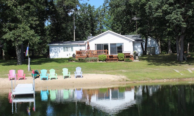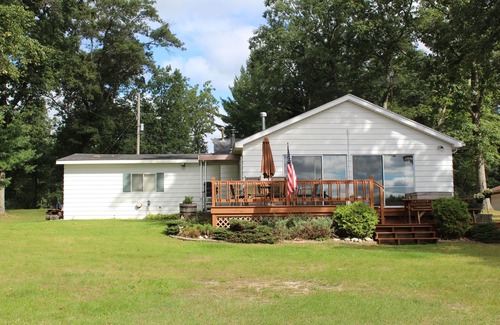 Our lakefront home features 2 bedrooms, and 1 ½ baths. One bedroom features a queen bed, and the other features a full size bed. This sleeps 4 comfortably, and we are limiting the house rental to 4 people. The house has a large great room that overlooks the lake, with 4 big full patio doors/windows, so the lake view from the home is exceptional. The kitchen is large, with all the conveniences of home! The large deck, complete with table and chairs, and grill, overlooks the lake. This house is handicap friendly. There are no stairs getting into the home.