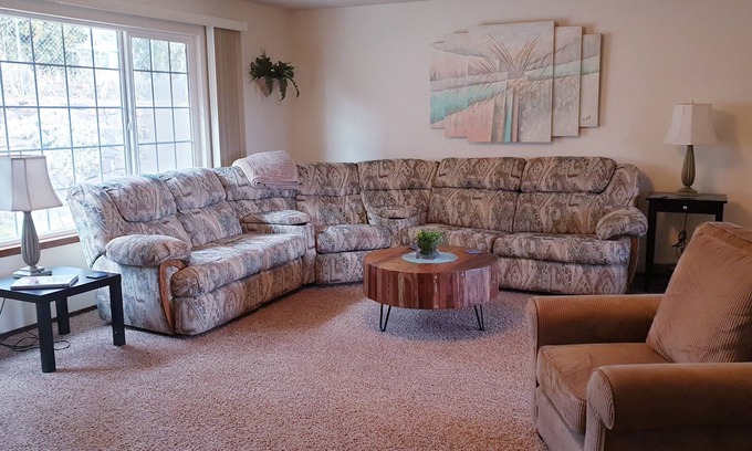 Upon arrival you will enter entry foyer leading to the living room, kitchen and dining room. The living room is furnished with a large sectional couch and one accent chair for encouraged relaxation. You can enjoy watching movies on a 55” smart TV with blue ray player, free Netflix or stream your favorite movies via our free Wi-Fi. The dining room is open to the kitchen area. The kitchen is fully stocked with spices/herbs/coffee, cookware, glassware and dinnerware and coffee maker everything you may need is provided. Just grab your groceries and you’re set to prepare your favorite home cooked meals. There is a laundry facility in the unit with a washer and dryer and we do supply basic laundering supplies.