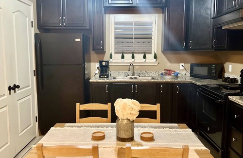 Full kitchen with cooking essentials is included so can can prepare and enjoy your favorite meals. Dining table comfortably sits four people.