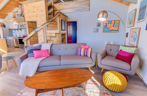 Whimsical Dunes is a colorful and sunny single level with loft home in the Bayshore Community of Waldport. There are two comfortable bedrooms that offer king size beds that can be turned in to two twins with advance notice. Between the two bedrooms is a newly remodeled bathroom with a walk in shower that was built with no lip allowing easy access for those that need it. The loft is a perfect space to escape to enjoy a good book, look out the windows and watch for whales or tuck away the kids in their own little hideaway. In addition, there is a half bath off of the laundry room. Watch the waves or one of our spectacular sunsets from the ocean front deck, enjoy the hot tub after a day of beachcombing, or grill up some fresh fish caught from one of the fishing vessels in Newport!