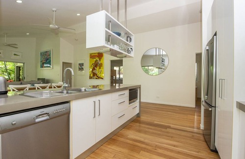 Enjoy your days lazing by the pool or relaxing on the deck. This large family home offers 3 bedrooms with air-conditioning & 2 bathrooms in the main house and a self-contained pavilion with a private outdoor bathroom located off the rear deck. Whispering Palms will make you feel a million miles away from the hustle and bustle of life with its abundance of palms and bird life surrounding the property.