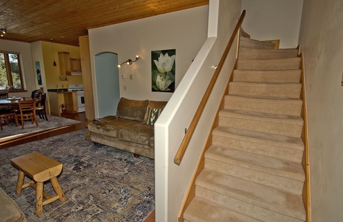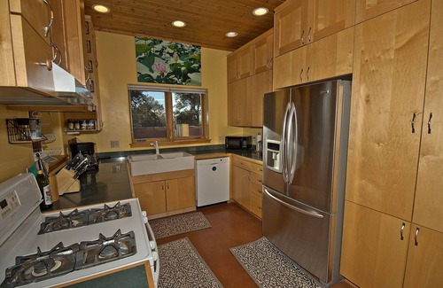In the main house first floor you will find an open spacious living area with huge picture windows to take in the glorious views of the Sangre de Cristo Mountains. Enjoy watching the peaks from the cozy couch, grab a hot drink or cook up a big meal in the kitchen, which adjoins the living area and dining room. The kitchen is big and open with plenty of counter space to spread out and cook up some tasty meals. Stocked with cookware and bakeware you can stay home and enjoy home-cooked meals while you retreat. A cozy half bath on the first floor so you don't have to go too far when you are enjoying the kitchen and living area.