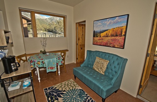 The studio space is located just a few steps out the front door entrance. This sperate building opens up to a small living area with a drink station for coffee, teas and water. There is a dining table that seats two as well as a loveseat. The full bathroom has a spacious shower, sink and toilet, and adjoins the living area for both rooms to use. The larger bedroom features a queen-sized bed with a walkout patio that overlooks the garden area. This room features great valley views, and you can sit in your bed and watch the stars at night. The second bedroom features a queen bed and picture windows with mountain views.