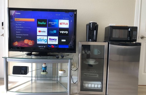 While you're here, you can enjoy all the comforts of home and more, including a stovetop and free WiFi, as well as a Smart TV and Hulu. Other amenities include a memory foam bed, a freezer, towels, and a mini-fridge.