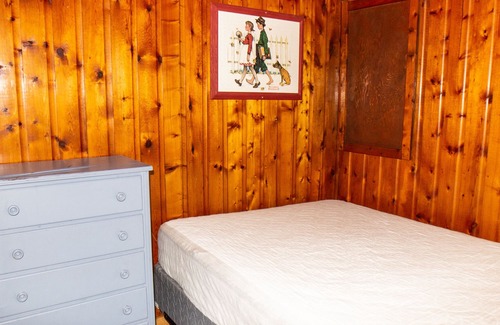 The cabin features 2 private bedrooms with full-size beds and a living room with a fold-out full-size futon. The cabin features a private bathroom and kitchenette with a stove and refrigerator. All cabins are furnished and come with a charcoal grill and picnic table.