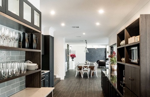 The exquisite master suite will take your breath away and is perfect for brides or special occasions. Indulgent in size, this suite would be the pride of any 7-Star hotel. Featuring a marble walk-in rain shower room, make up vanity, his and hers vanity, herringbone tiled hydro spa bath with feature lighting, and an enormous walk-in dressing room with mirrors.