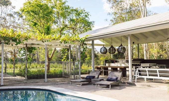 The secluded pool nestled in the ground, illuminated by night lights, mirrors the delight of summer evenings in the Hunter region, offering a serene backdrop of the lush eucalyptus and spotted gum bushland.