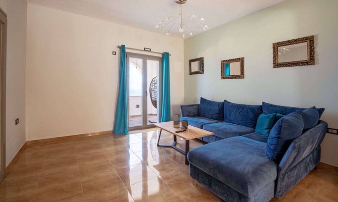Enjoy the decoration of this unique house which marries the traditional Santorini style with the modern house. The apartment has 3 bedrooms with different traditional style and modern touches. The living room follows the exact same style with a sofa-bed that blends harmoniously with the blue of the sea and the sky, providing unique relaxation.
