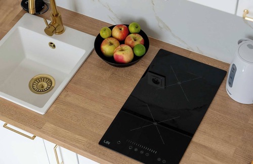 Induction hob, microwave, refrigerator with freezer, electric kettle, set of dishes, kitchen utensils, table and chairs