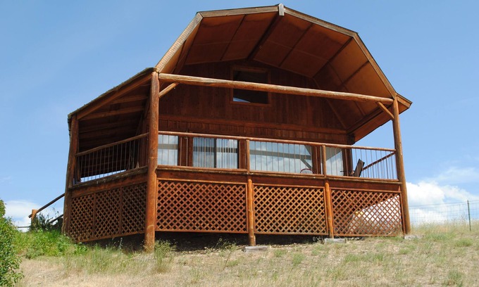 The largest cabin of 'Wilderness Spirit Cabins LLC'. A 759 square foot log cabin with 17 foot ceiling. Has a large loft with a king size bed. On the main floor is a living room with a futon for extra sleeping, small kitchen with full size refrigerator, full bathroom, and bedroom with a queen bed. The kitchen has a full size refrigerator, four burner electric stove and oven and sink. A microwave, toaster oven, toaster and coffee maker plus dishes and cooking pans and utensils are included. The bathroom has an antique claw-foot tub which has a shower attachment to take a bath or shower. All linens and towels are included. The deck is on two sides of the cabin with the 360 degree heavenly view. Great for sitting and enjoying the beautiful Bitterroot sunsets behind the mountains while enjoying a cup of coffee. Also outside is a dining table with chairs, rocking chairs to enjoy the view, a charcoal grill, and your own private firepit with benches around it for evening enjoyment. 'Eagle Nest' sits on top of the hill behind the main house and the other two cabins. Cabin is decorated with the original watercolor paintings and limited edition reproductions of co-owner/artist, Tracy Rose Moyers, available for purchase. Located in the beautiful Bitterroot Valley, which is considered the 'banana belt' meaning the area has milder weather compared to the rest of Montana. Bitterroot is also considered on of the best fly-fishing areas in the country.