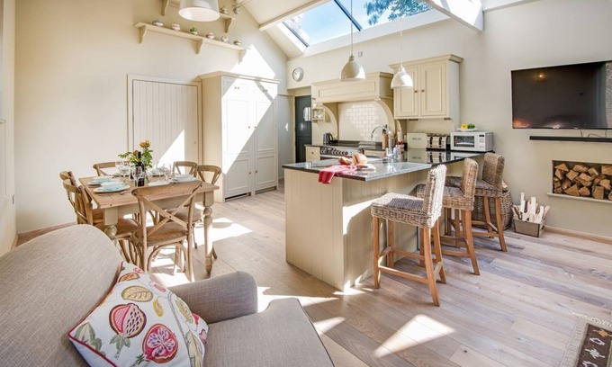 Fully equipped kitchen with Rangemaster double oven cooker with induction hobs, microwave oven, toaster, electric kettle, large dishwasher, integrated fridge and freezer. A coffee Nespresso machine is also available, guests are welcome to bring their own capsules. A washing machine and dryer is provided in a separate area of the property.
