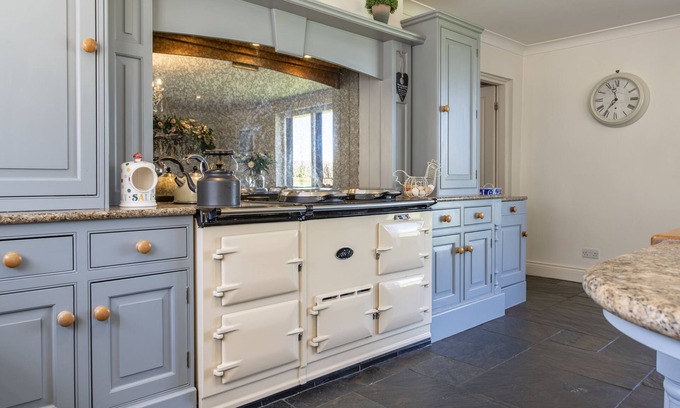 With a large island, four oven Aga, fridge/freezer and dining table with seating for 12 guests.
