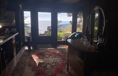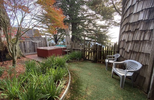 WINE BARREL - Constructed from a used 1950's wine barrel and made into a fantastic romantic cottage for two. Enjoy the view of the Pacific from the upstairs kitchen/living room, downstairs bedroom, or patio with fire pit. A fenced-in garden area gives you plenty of privacy. This quaint home will sleep 2 people, there is a queen bed, full bathroom and private hot tub.