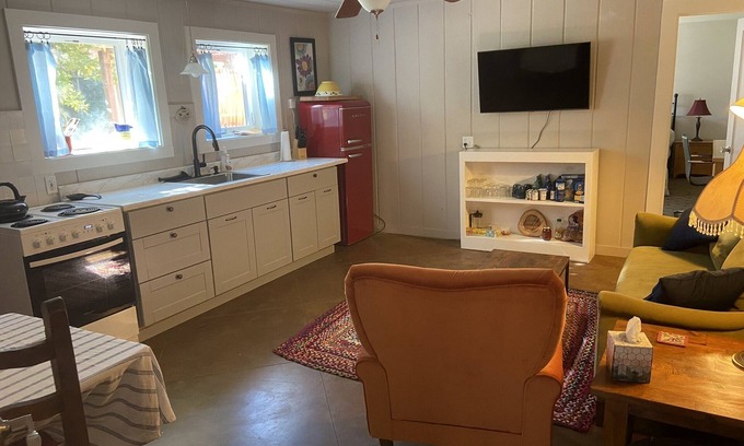 Take it easy at this unique and tranquil getaway on the Olive Farm. Your space is all yours with two private entrances. We are on 5 acres next to the Russian River. There are 300 olive and fruit trees, a large Summer garden, chickens, barn cats and a bocce court. Cloverdale is a 30 minute walk down the river trail or a 5 minute drive. It's quiet here; a perfect retreat from a busy day or week at work.