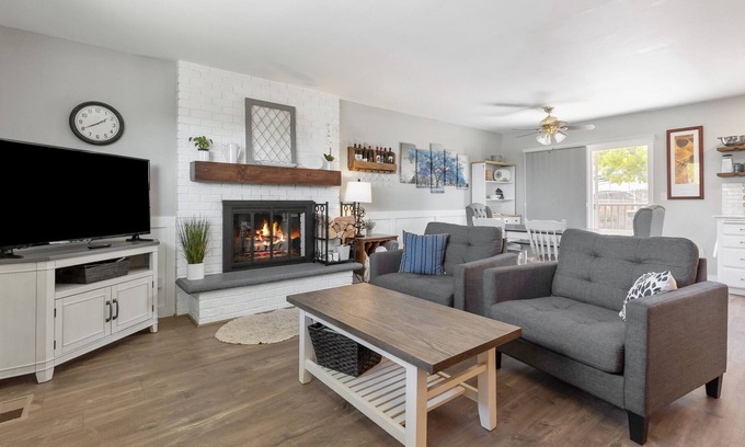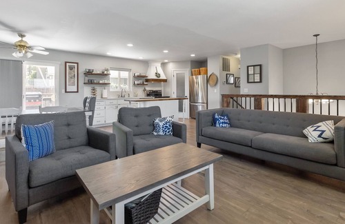 This comfy home is perfect for families, anyone traveling with a big group, or if you're just looking for a stay in a quite neighborhood that's close to everything. There are two King beds, one Queen, and two sets of twin-over-full bunk beds! This house is super child-friendly with a baby gate for the stairs and a pack-and-play.