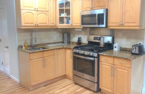 The home has three bedrooms and two bathrooms, accommodating up to 6 guests comfortably. The bathroom includes shampoo, conditioner, body soap, toilet paper, and hot water. The bedroom includes towels, bedsheets, hangers, linens (cotton), extra pillows and blankets, a closet, a dresser, and a walk-in closet.