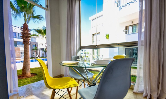 Located in the center of the new residential heart of Agadir offering an area of 100 M2.you will be seduced by its contemporary decor, its comfort, the pool and its serenity.