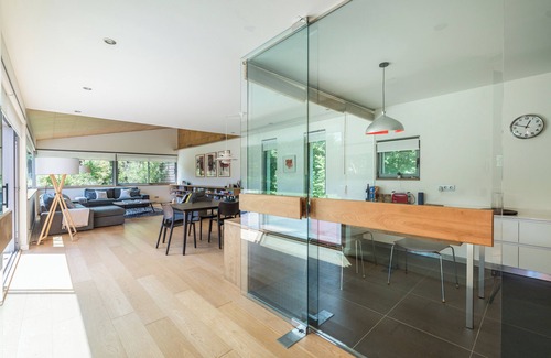 The full kitchen of 18m2, is integrated in the dining room separated by glass.
