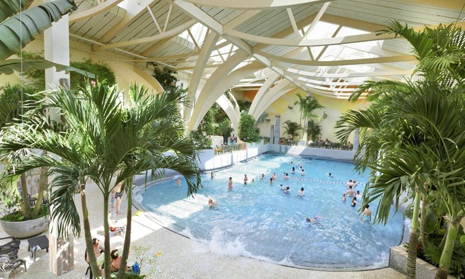 The resort features a covered "Market Dome" with various restaurants, a panoramic terrace overlooking the beach and lake, shops, and a House of Games with a children's activity program called "Wannabe." The subtropical water paradise "Aqua Mundo" offers indoor and outdoor pools, slides (up to 130 m), and a wave pool, providing endless entertainment. Other facilities available (some extra charges may apply) include a sports arena, archery, mini golf, pony riding, and boules.