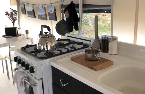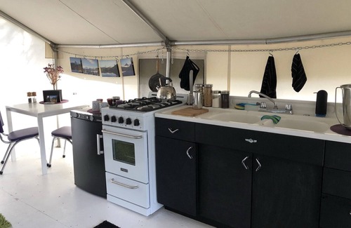 Vines and Puppies Glamping Hideaway offers a one of a kind experience creating memories to last a lifetime with a wood fired hot tub, amazing views and delicious food. Located 8kms south of Jade City. Spend the night soaking up our off grid lifestyle and maybe see some northern lights! Our tent is fully equipped with a mini kitchen including propane range and fridge. A comfy double bed and wood stove to keep you toasty warm. Delicious homemade dinner and breakfast are included in your stay. Easy highway access and parking. Please note there is stair access from the parking lot to the tent.