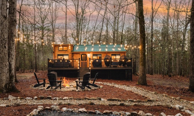 Set back into the rustic Georgia landscape, you will find your own private, cabin oasis! The small cabin has 2 bedrooms and 1 bath. The space has wonderful amenities such as a hot tub, lounge seating, fire pit area, grill, and outdoor games. Spend a night soaking in the bubbling hot tub under the twinkling string lights or light up a roaring bonfire with he provided fire wood to roast the perfect marshmallow.