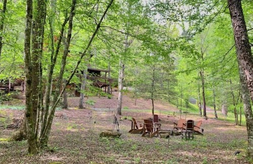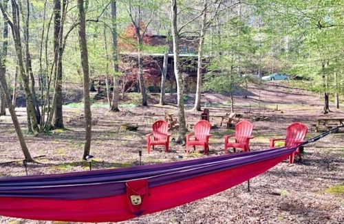 The forest and the mountain waters make this the most perfect woodland wonderland getaway! From the cozy campfire gathering area to napping in the hammocks beside the creek banks; you and your guest will revel in the scenic beauty all around you. As you step inside the cabin, you will be welcomed with the warm and inviting atmosphere of a true mountain escape with it's open and cozy layout that lined with windows and floor to ceiling fireplace. A perfect intimate gathering place for couples and good friends!