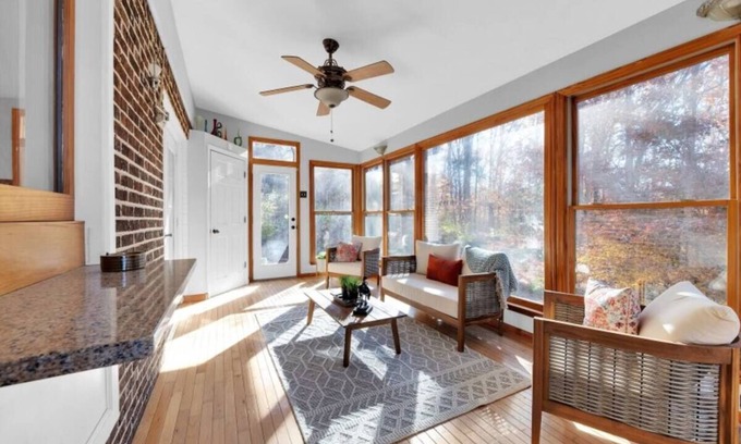 The sun room offers stunning views of the wooded lot, providing a tranquil setting where you can enjoy your morning coffee or relax with a good book. The large windows allow natural light to flood the room, enhancing the peaceful ambiance.