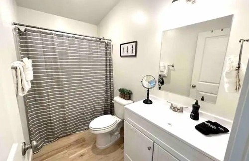 Inside, you’ll enjoy a full kitchen stocked for all of your cooking needs. We have two bedrooms with Queen sized beds, full sized washer and dryer, cozy living space with sectional sofa and t.v kitchen bar and stools for eating at, and fully stocked bathroom and tub.