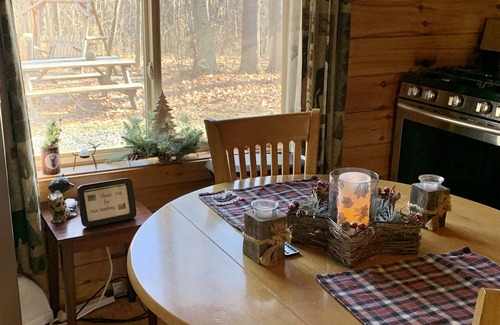 The living room has a seasonal gas fireplace (closes April 30th for the season) and HDTV for your streaming purposes, DVD and CD player with several DVDS, a sofa, and a small table. The Woods Cabin also has internet access for guests. All linens and towels are provided (we provide one bath towel set and one hot tub towel for each registered guest). Flannel sheets are available upon request.