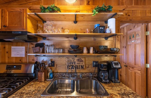 Outside of the cabin, there is a screened front porch and a private rear deck. A charcoal grill is available for cooking. Also located outside is a fire ring and a private, covered hot tub. Both firewood and charcoal can be purchased and made available upon request.